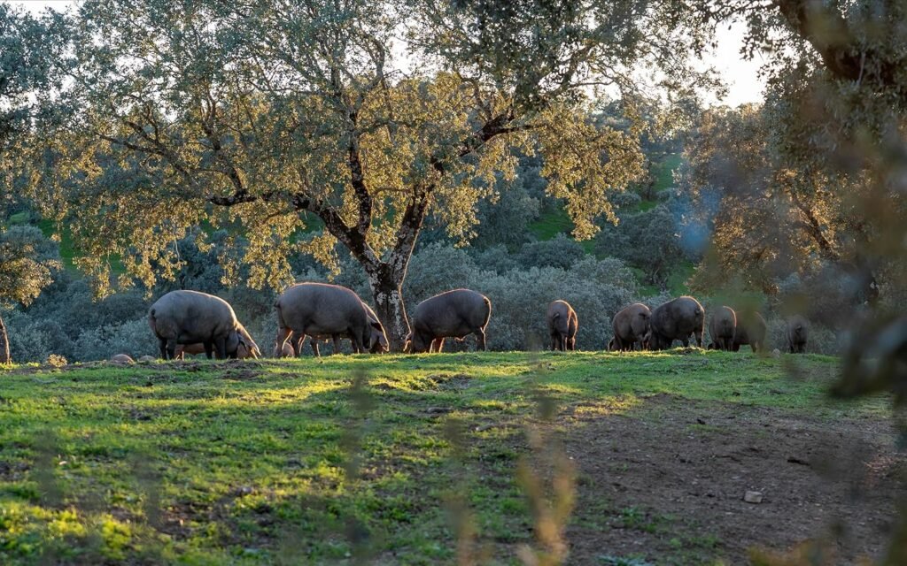 Los cerdos de raza pura ibérica que dan lugar a este jamón son criados en libertad, en entornos de dehesa, siguiendo los estándares más estrictos de alimentación y bienestar animal. La dieta a base de bellotas durante la montanera asegura: